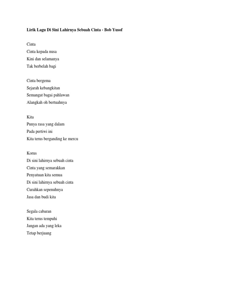 Bukan sebab tak ada sambutan sebab diri sendiri pun. Contohnya cinta ahli keluarga sahabat sesama. Lirik Lagu Di Sini Lahirnya Sebuah Cinta - Bob Yusof Cinta Cinta kepada nusa Kini dan selamanya Tak berbelah bagi Cinta bergema Sejarah kebangkitan Semangat bagai pahlawan Alangkah oh bertuahnya Kita Punya rasa yang dalam Pada pertiwi ini Kita terus berganding ke mercu Korus Di sini lahirnya sebuah cinta Cinta yang semarakkan Penyatuan.